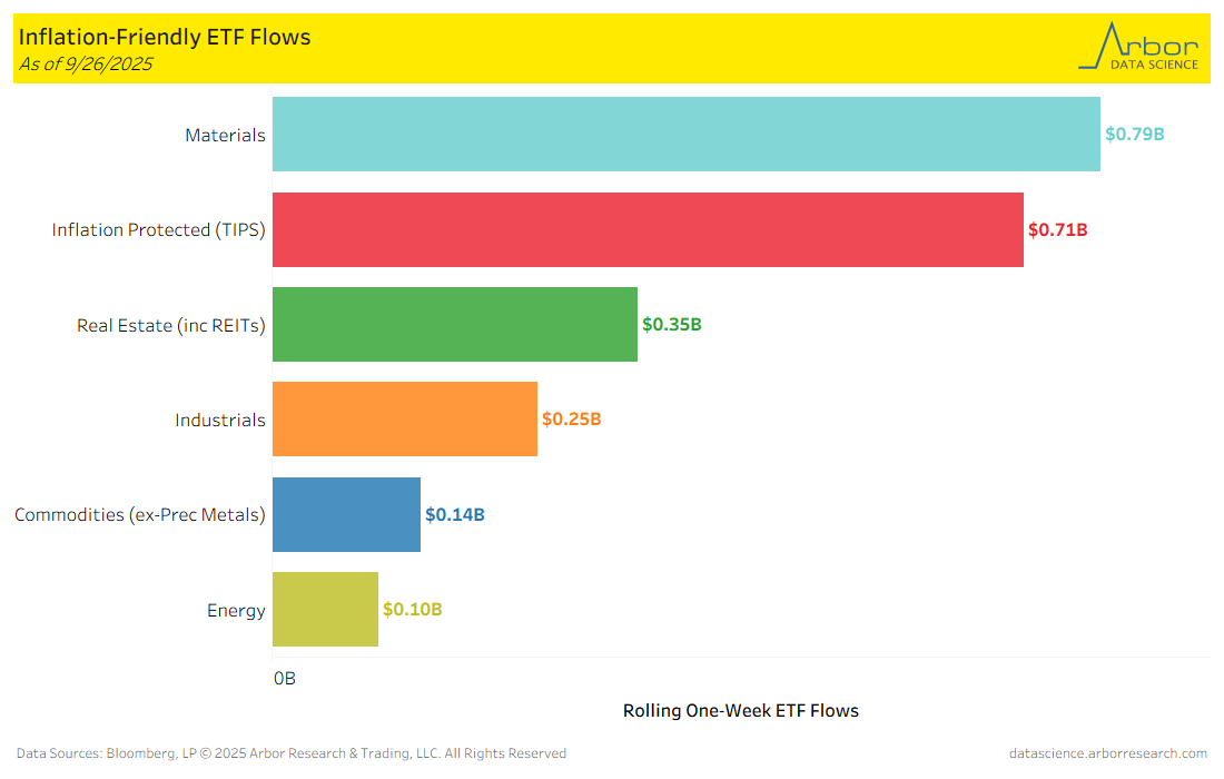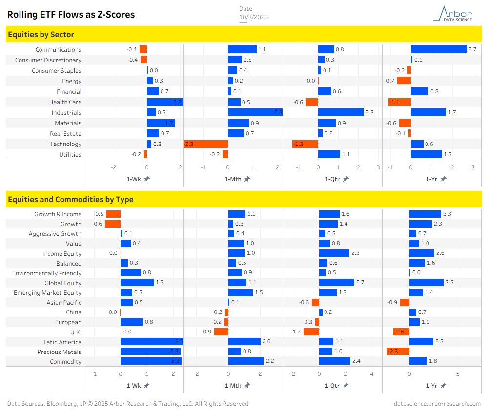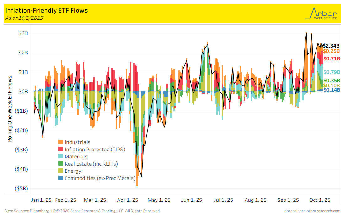 - Of the 16 ETF categories charted below, 14 categories had net inflows for the week that ended on 10/3/2025.