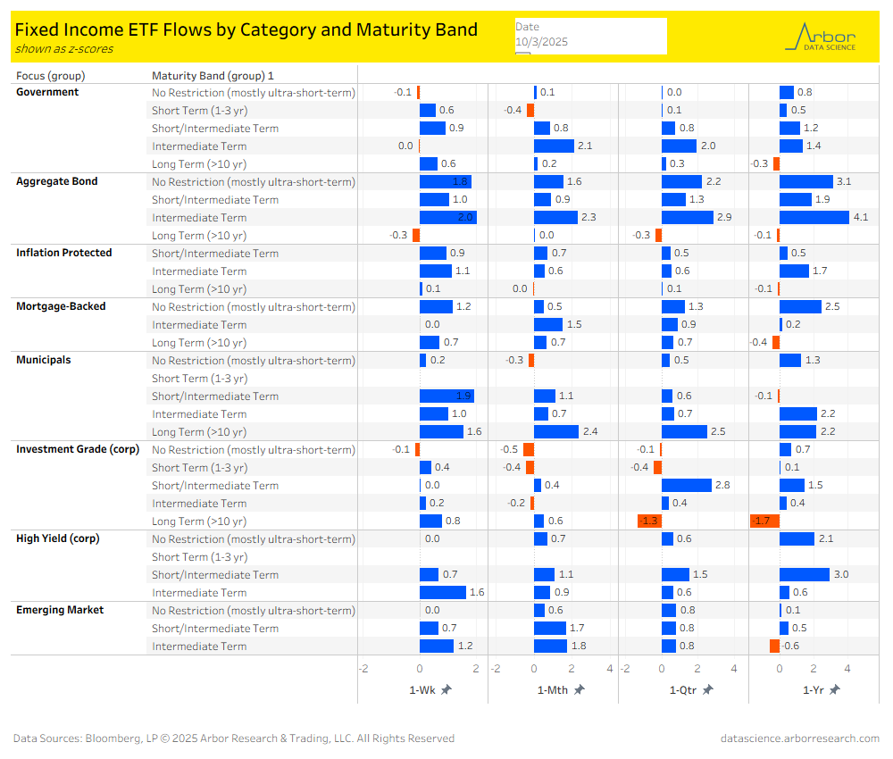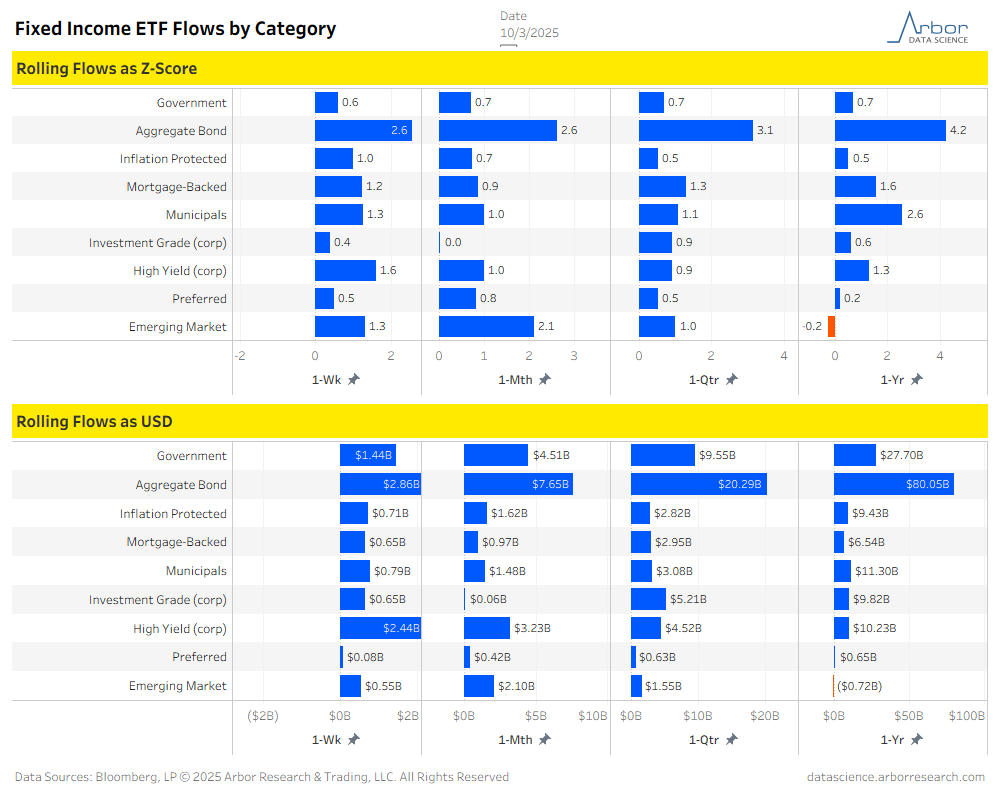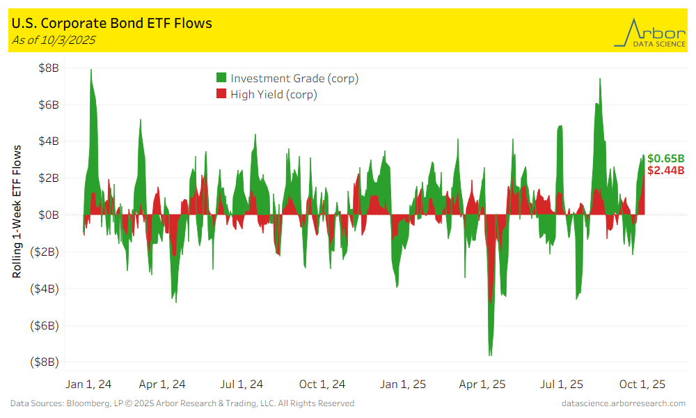 - Corporate bond ETF flows were positive for the week ended 10/3/25, with High-Yield ETFs gaining $2.44 billion and Investment-Grade ETFs gaining $0.65 billion.