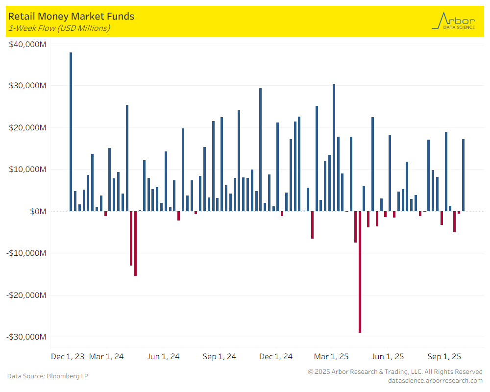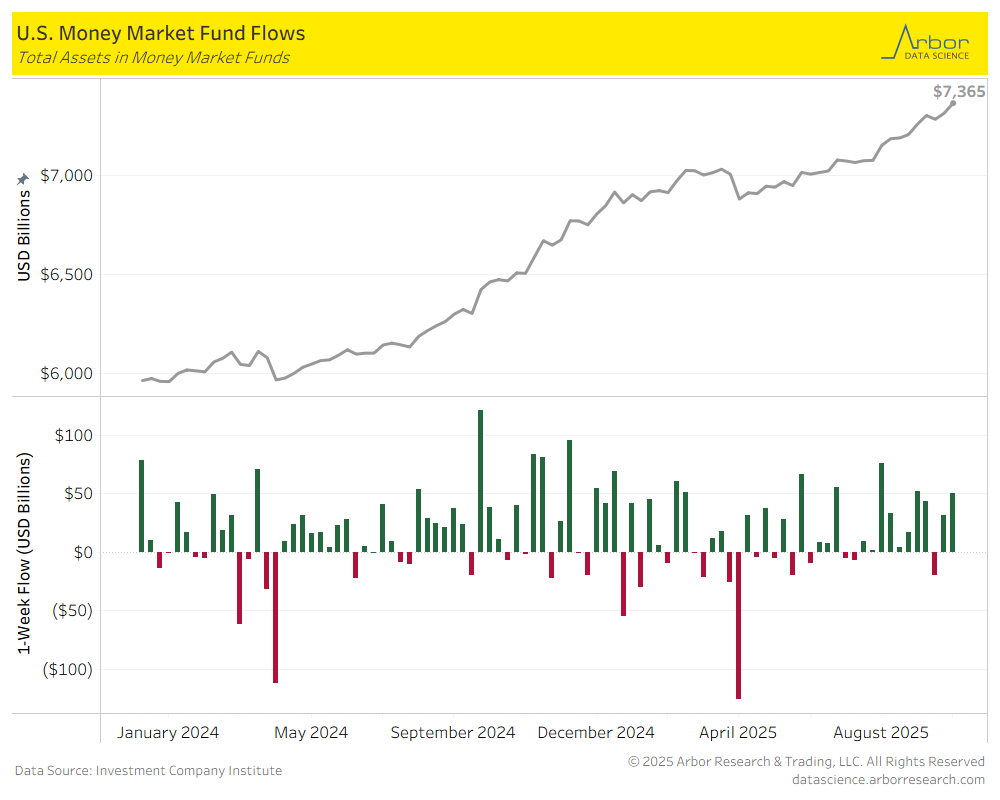 - The amount invested in Money-Market Mutual Funds (MMMFs) increased to $7.365 trillion in total assets on 10/1/2025, compared to $7.315 trillion in total assets on 9/24/25.