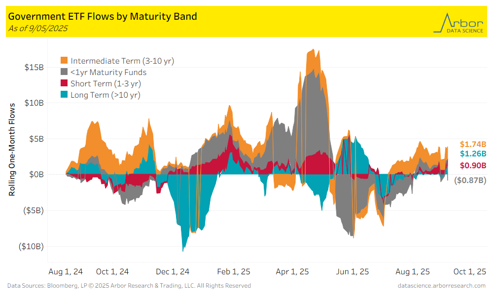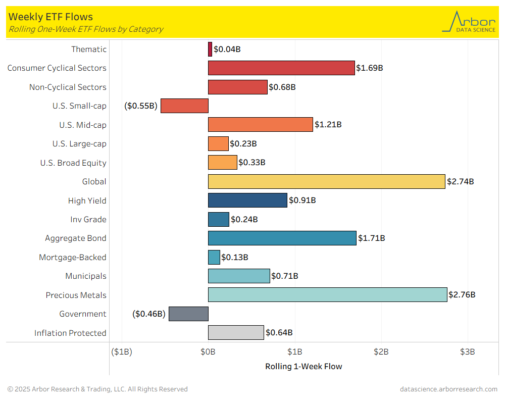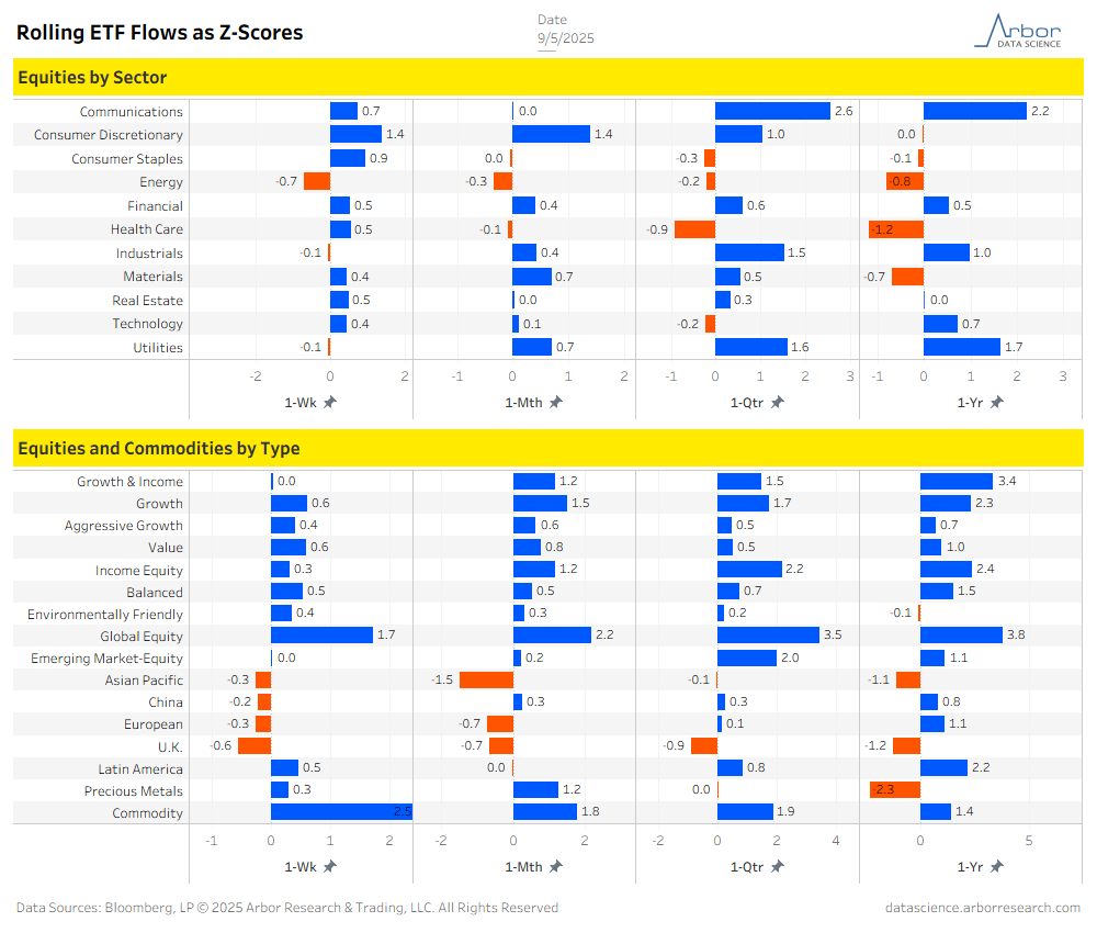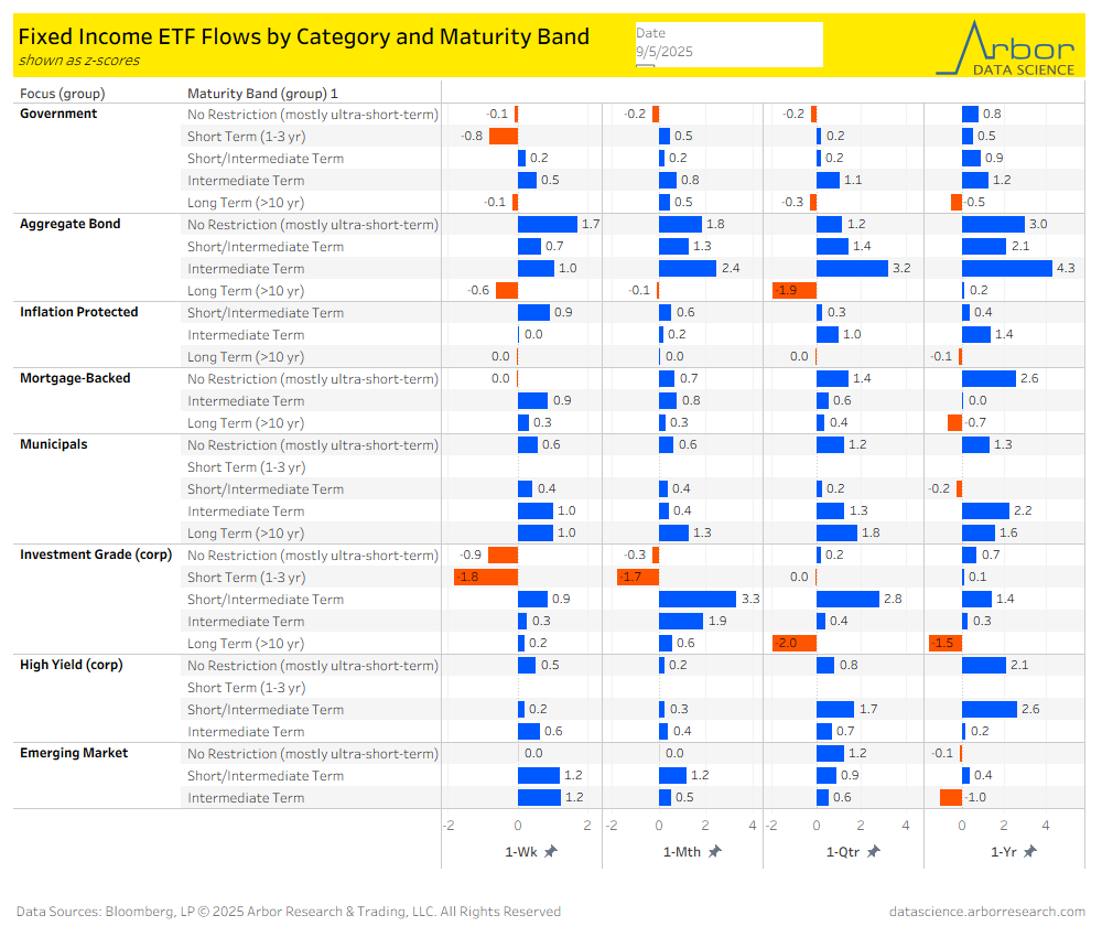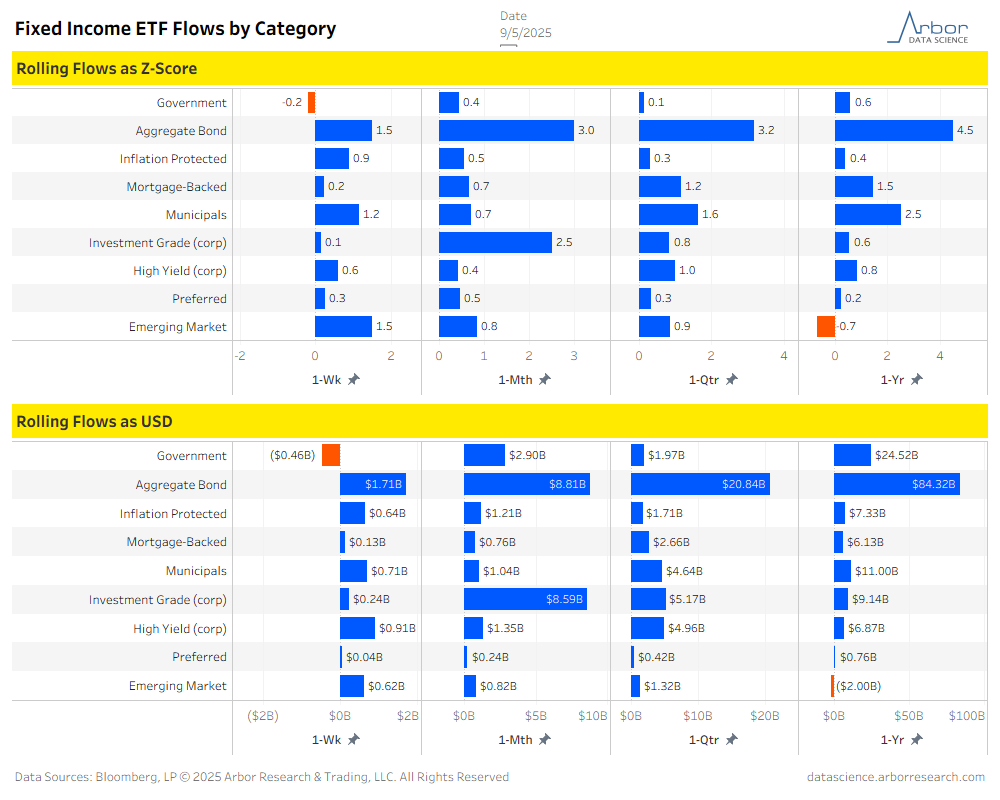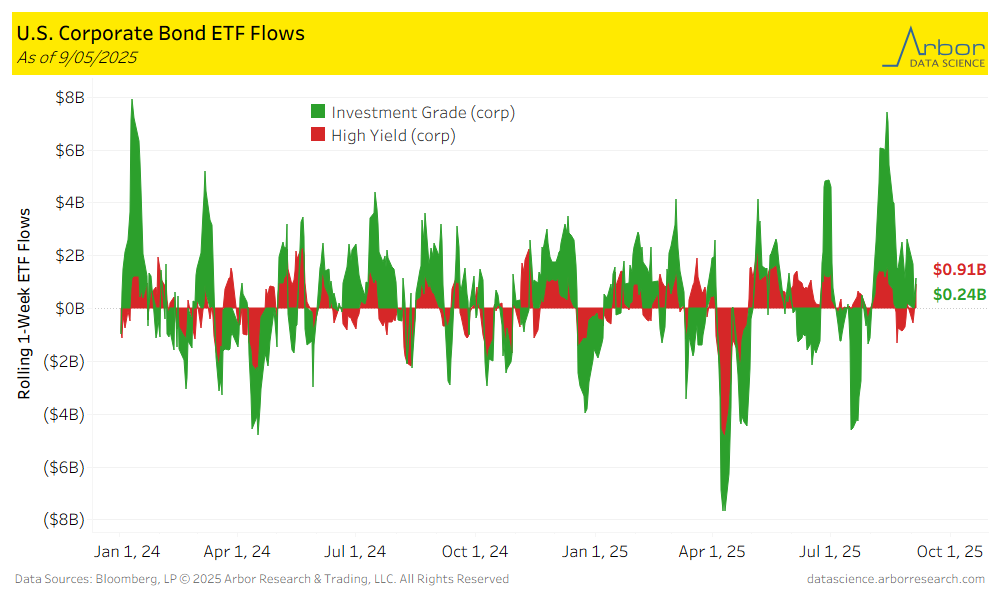 - Corporate bond ETFs were positive for the week ended 9/05/25, with High-Yield ETFs gaining $0.91 billion and Investment-Grade ETFs gaining $0.24 billion.
