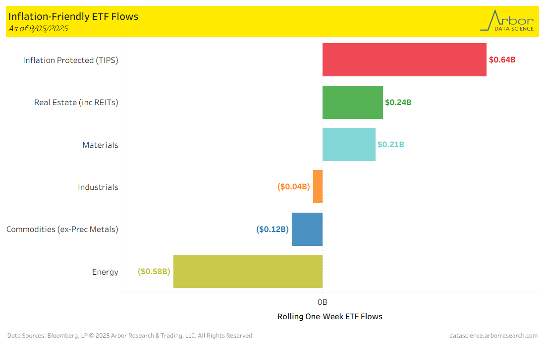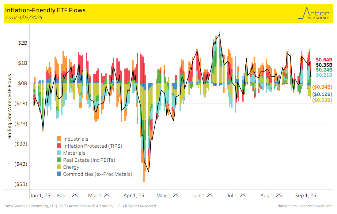 - Aggregate flows (black line in chart below) were positive for the week ended 9/05/25, with $0.35 billion of inflows. Inflation Protected (TIPS) had the largest inflows for the week at $0.64 billion. Energy had the largest outflows at $0.58 billion.