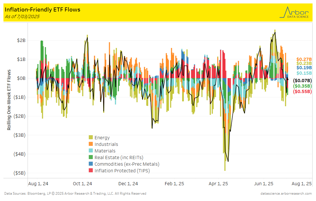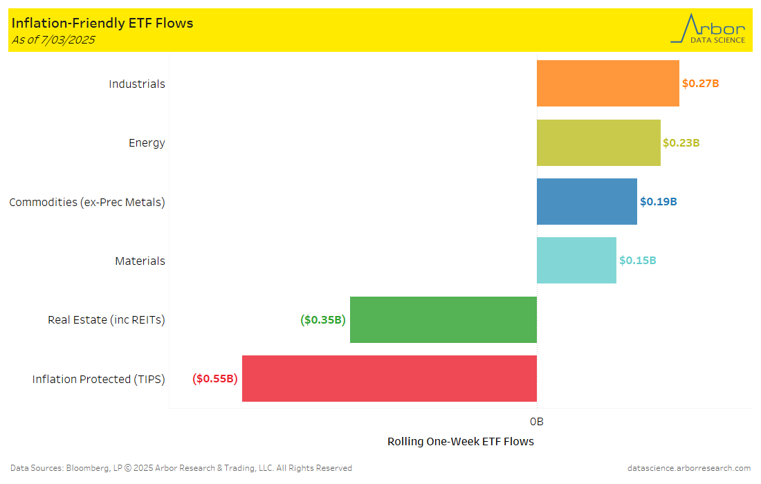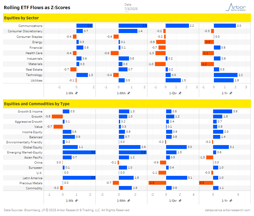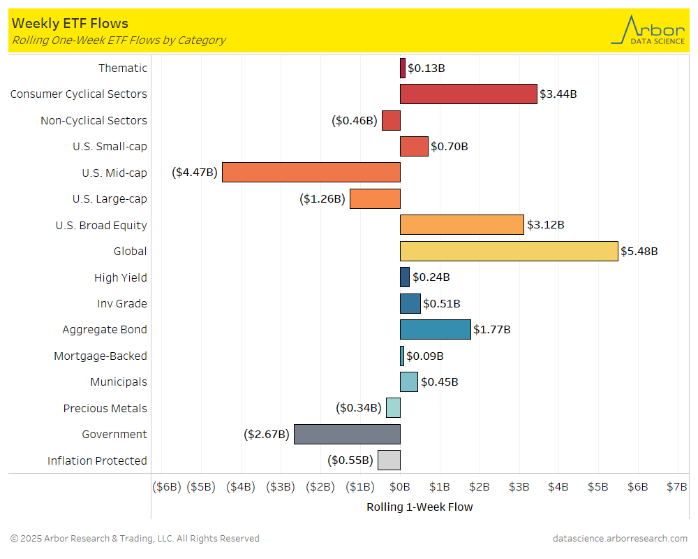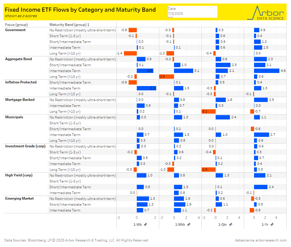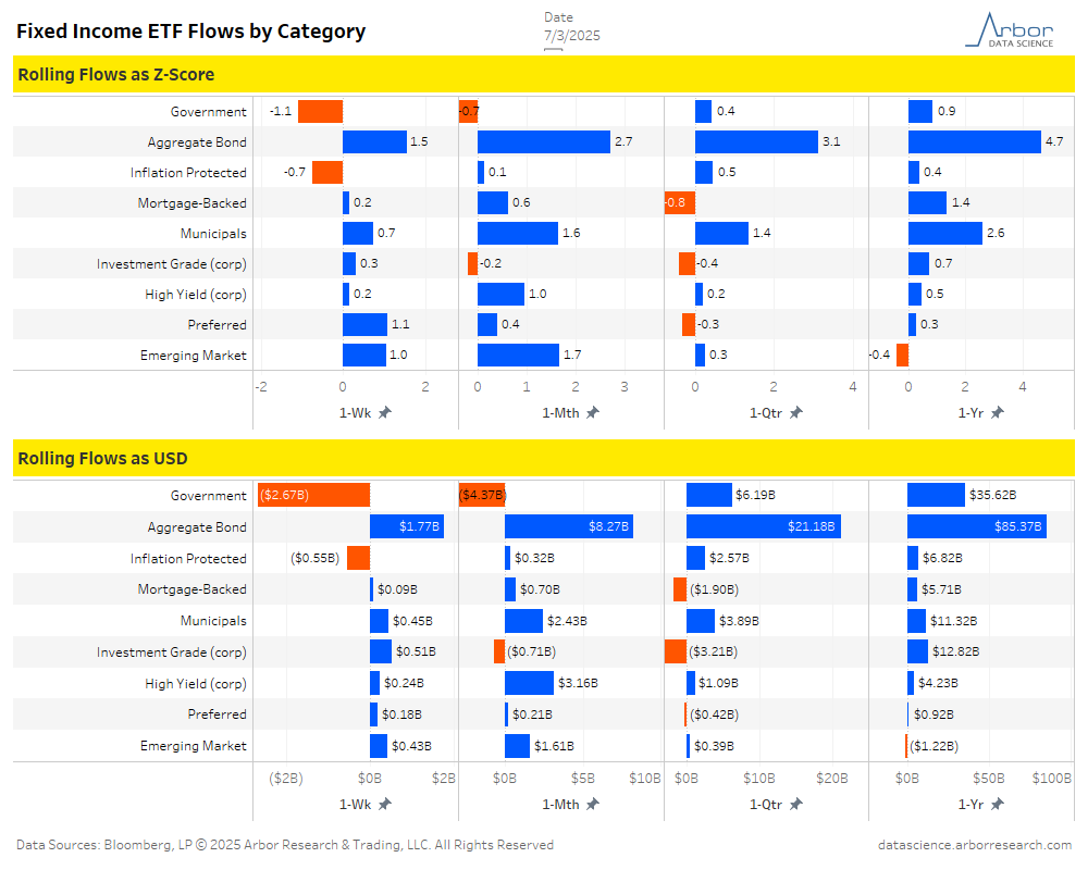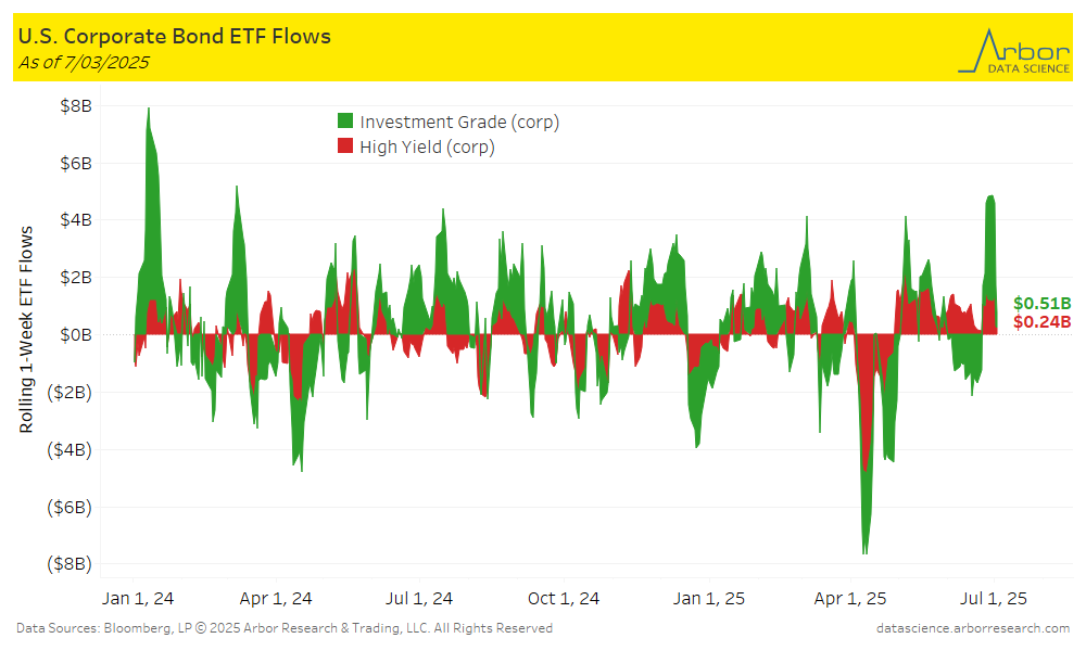 - Corporate bond ETFs were positive for the week ended 7/03/25, with Investment-Grade ETFs gaining $0.51 billion and High-Yield ETFs gaining $0.24 billion.