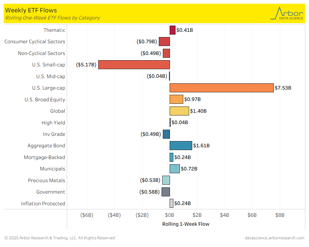 - The ETF category with the largest outflow for the week that ended on 8/1/2025 was U.S. Small Cap ETFs at $5.17 billion in outflows.