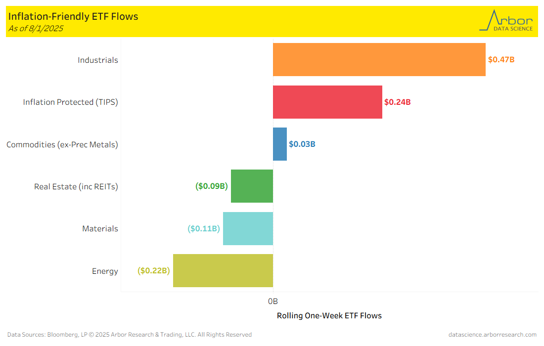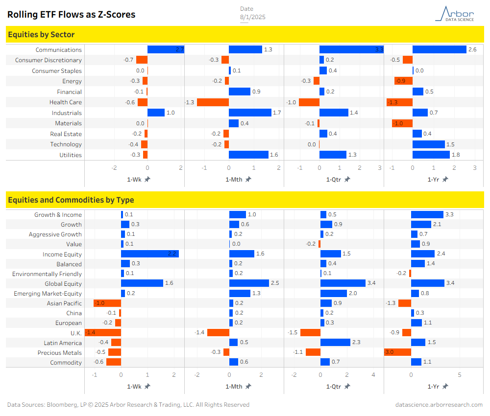 - The two ETF categories with the largest inflows for the week that ended on 8/1/2025 were U.S. Large-Cap ETFs, at $7.53 billion in inflows, and Precious Aggregate Bond ETFs, at $1.61 billion in inflows.