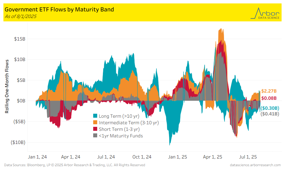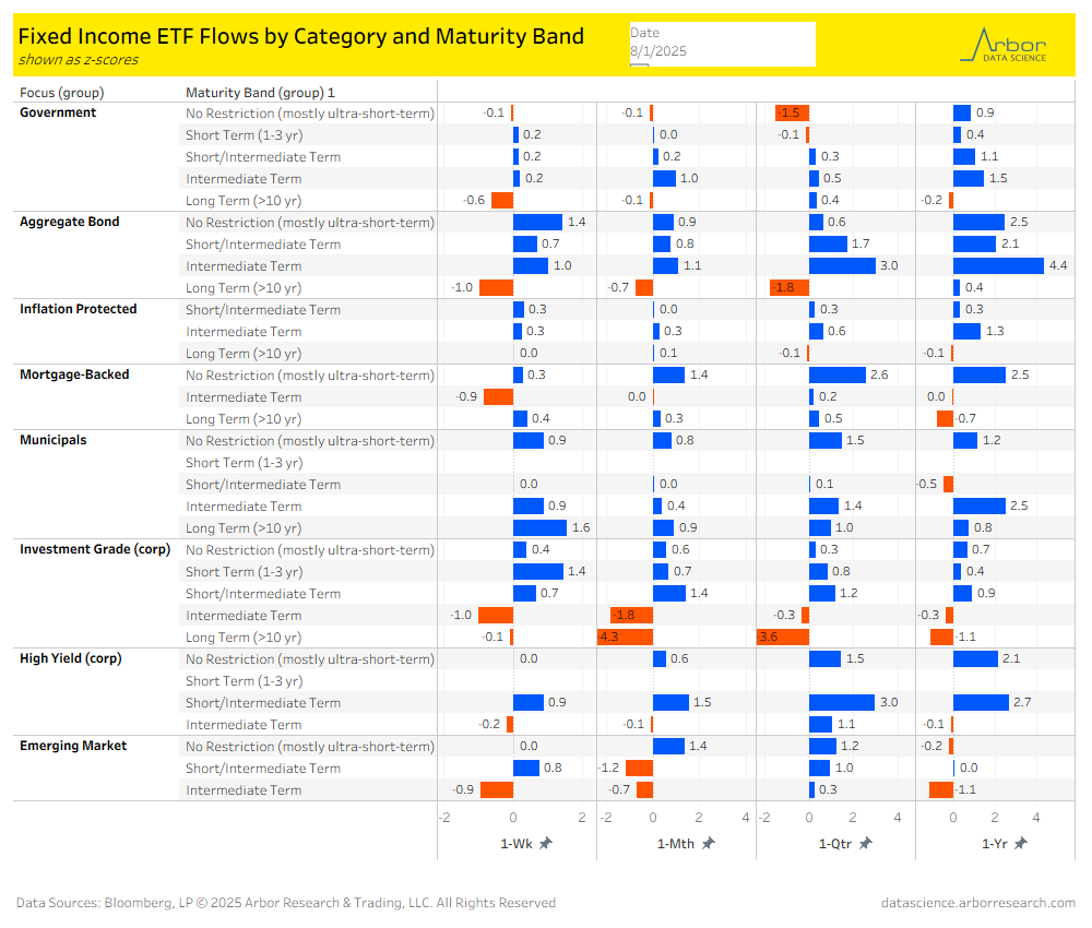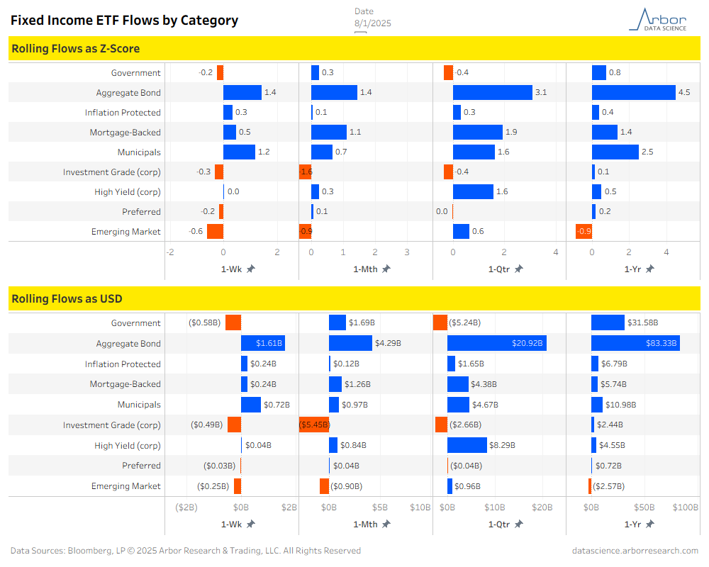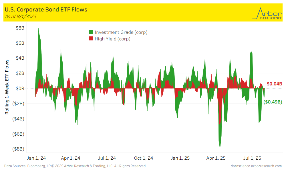 - Corporate bond ETFs were mixed for the week ended 8/1/25, with Investment-Grade ETFs losing $0.49 billion and High-Yield ETFs gaining $0.04 billion.
