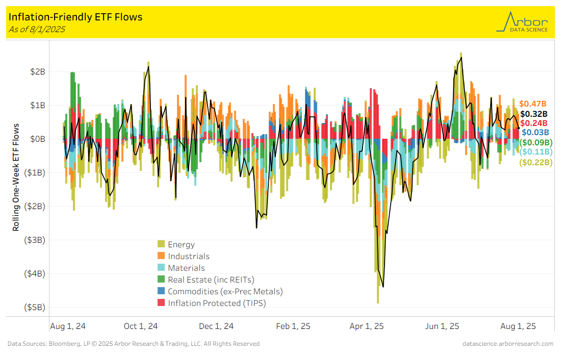 - Aggregate flows (black line in chart below) were positive for the week ended 8/1/25, with $0.32 billion of inflows. Industrials had the largest inflows for the week at $0.47 billion. Energy had the largest outflows at $0.22 billion.