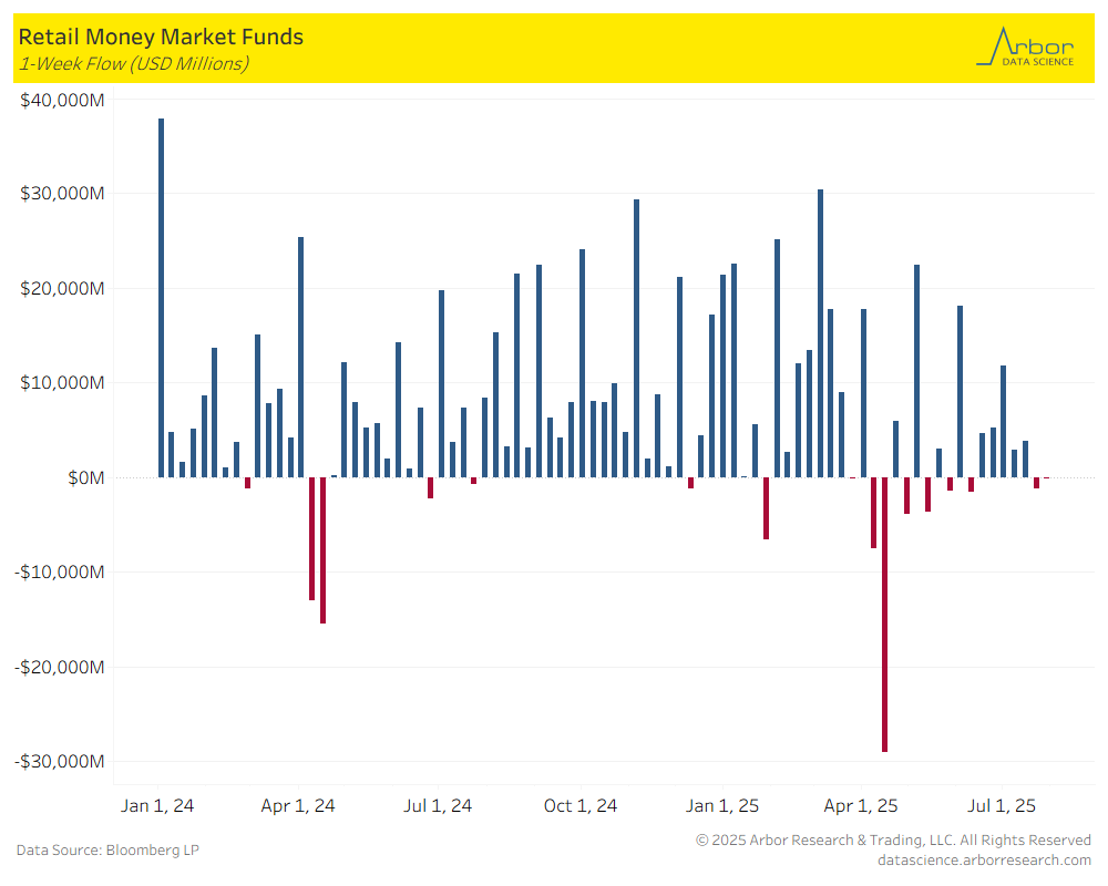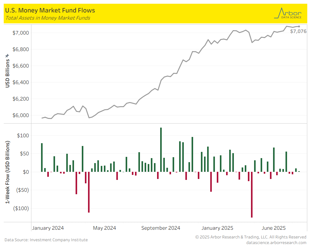 - The amount invested in Money-Market Mutual Funds (MMMFs) increased sligthly to $7.076 trillion in total assets on 7/30/2025, compared to $7.075 trillion in total assets on 7/23/25.