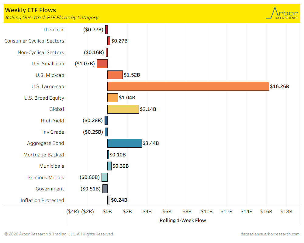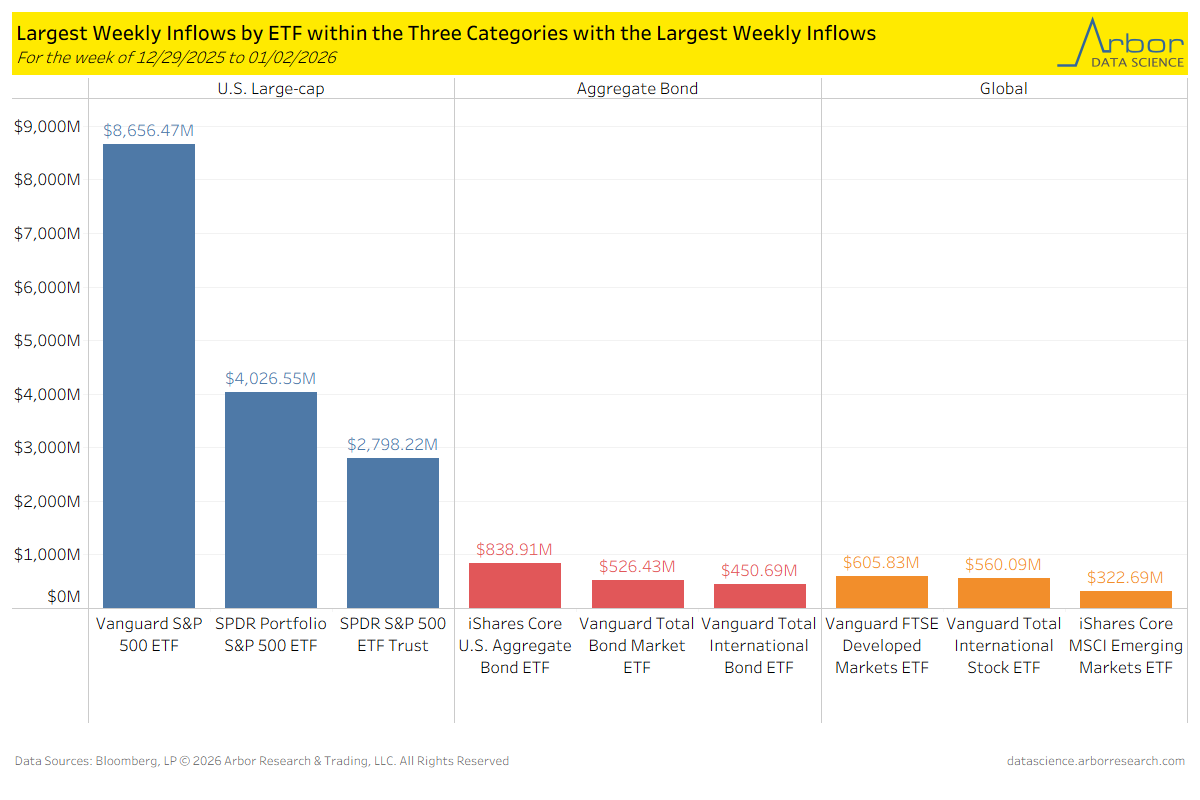 - The three ETF categories with the largest inflows for the week that ended on 01/02/2026 were U.S. Large-cap ETFs at $16.26 billion, Aggregate Bond ETFs at $3.44 billion, and Global ETFs at $3.14 billion.
