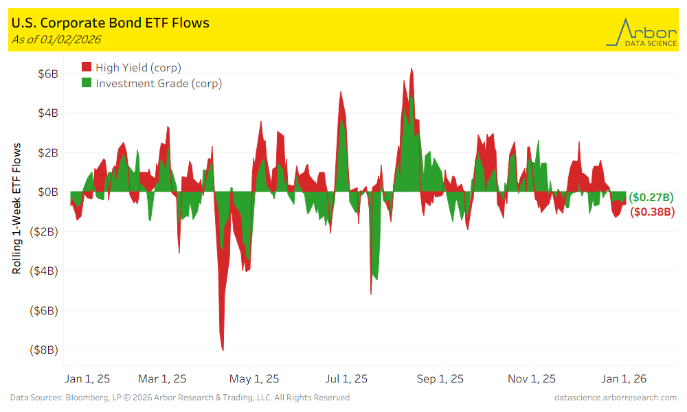 - Corporate bond ETF flows were negative for the week ended 01/02/2026, with High-Yield ETFs losing $0.28 billion and Investment-Grade ETFs losing $0.25 billion.