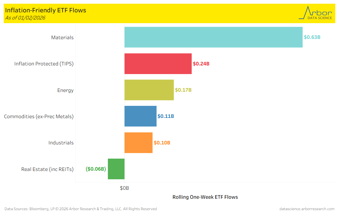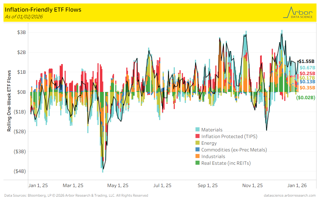 - Turning to inflation-friendly ETFs, aggregate flows (black line in chart below) were positive for the week ended 01/02/2026, with $1.19 billion of inflows. Materials had the largest inflow for the week at $0.63 billion.