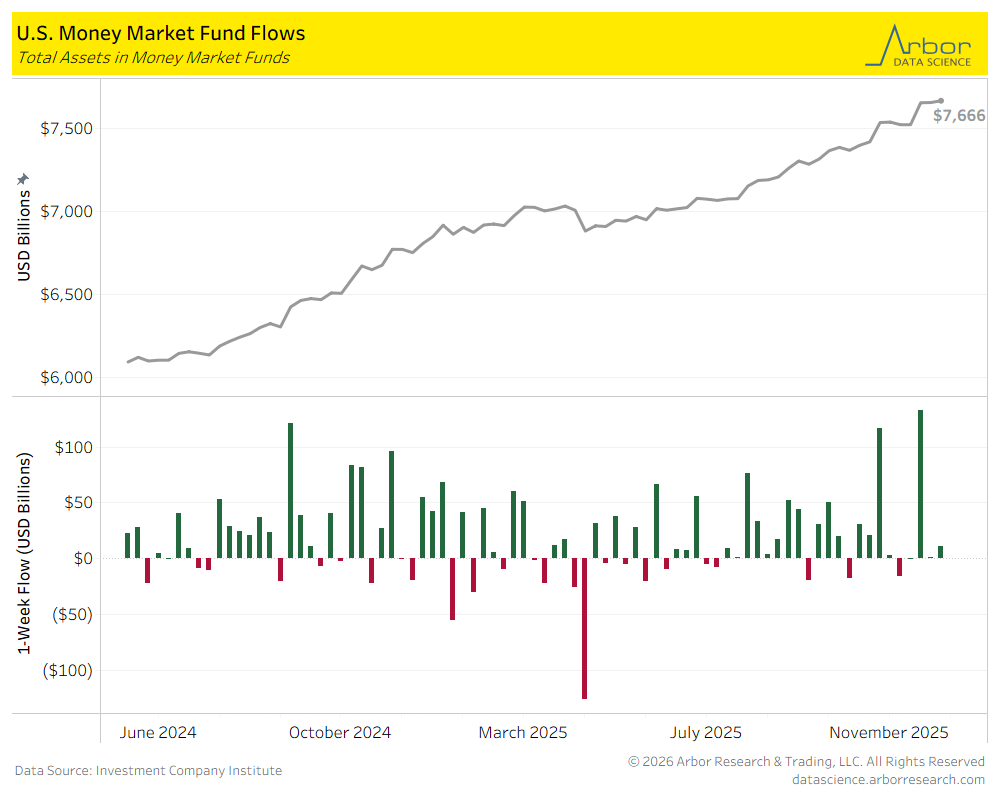 - The amount invested in Money-Market Mutual Funds (MMMFs) increased to $7.666 trillion in total assets on 12/17/2025, compared to $7.655 trillion in total assets on 12/10/2025. This data has not yet been updated for 12/31/2025.