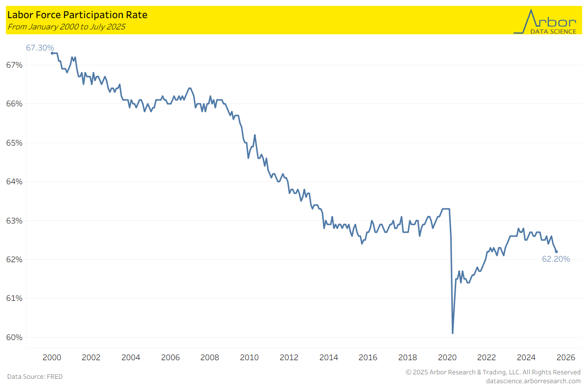 - In addition to this potential downturn in labor supply, the labor force participation rate continued to decline to 62.20% in July 2025.