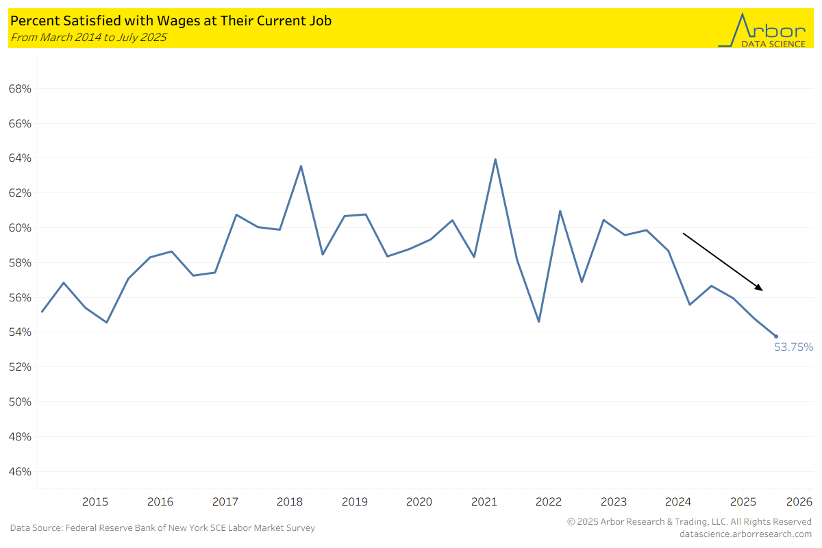- Only 53.75% of respondents were satisfied with their current wage in July 2025, an all-time low since the SCE Labor Market Survey began in 2014.
