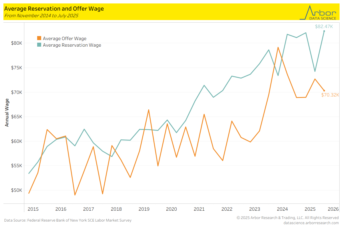 - The average reservation wage was $82,470 and the average wage offered for a new role was $70,320 in July 2025.
