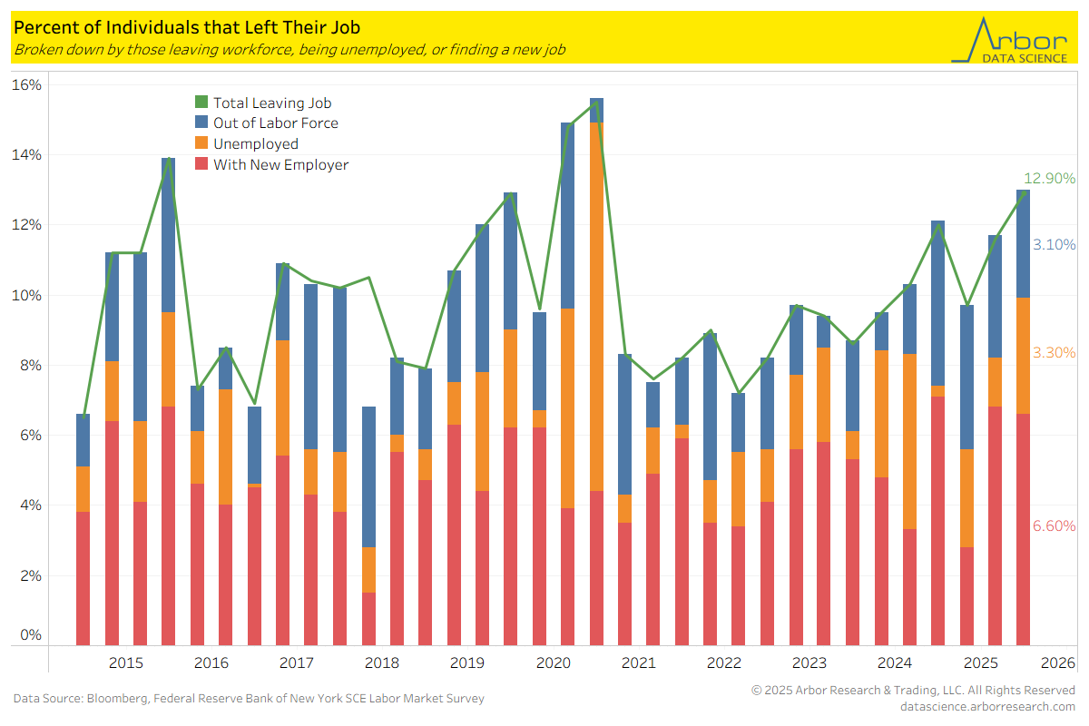 - According to the Federal Reserve Bank of New York’s SCE Labor Market Survey, 12.90% of those employed in March 2025 had left their job by July 2025. This was the highest level since July 2020 when 15.50% left their job after being employed four months earlier.
