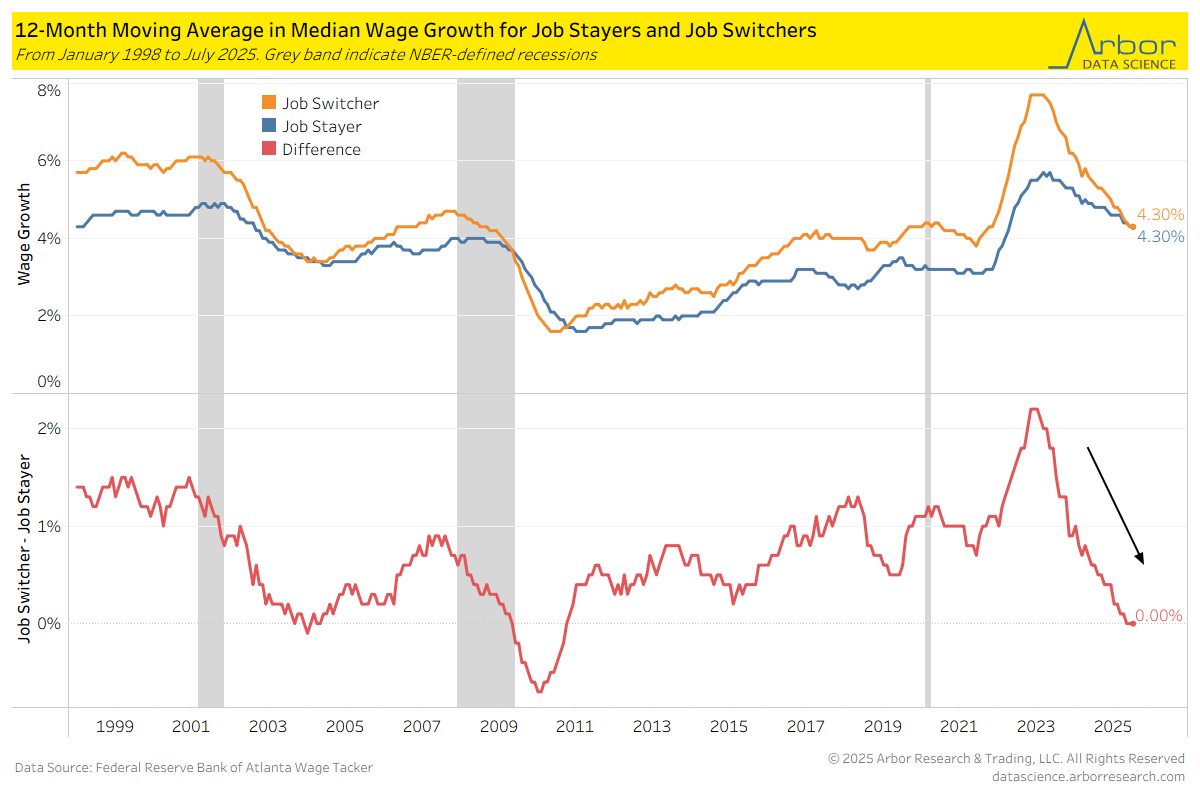 - According to the Federal Reserve Bank of Atlanta’s Wage Growth Tracker, the difference in wage growth for job switchers compared to job stayers was 0.00% in July 2025. This was the first time it was 0.00% since October 2010.
