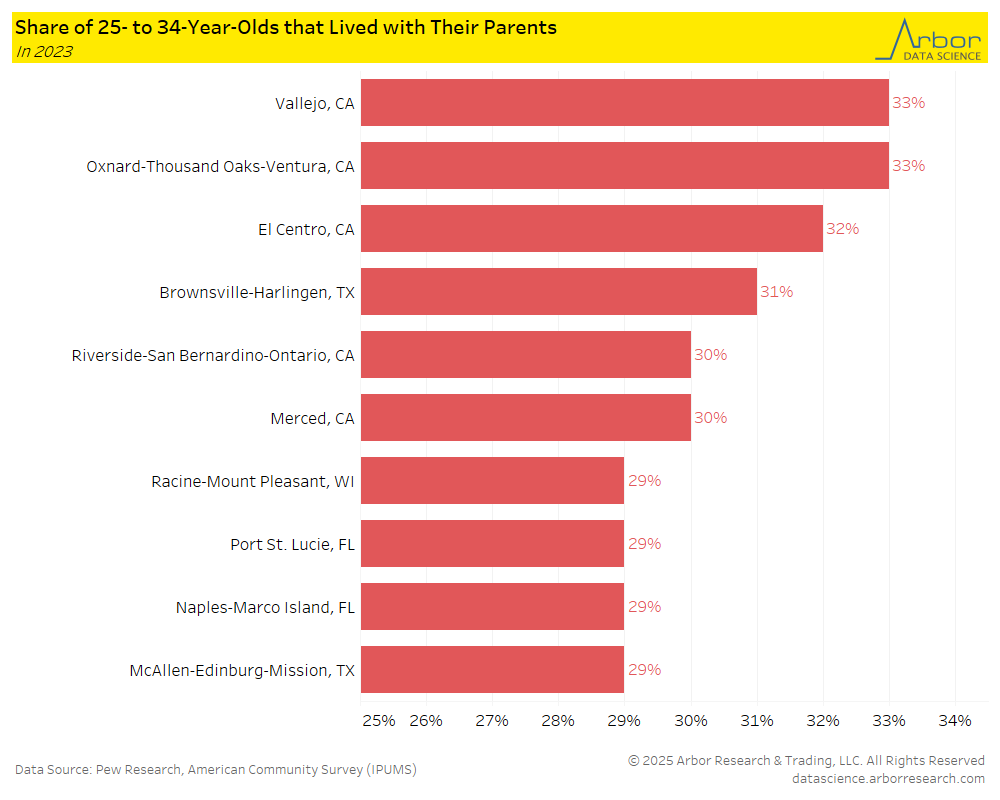 - 5 of the top 10 regions with the largest share of young adults living at home in 2023 were located in California. The state recently dismantled legislation that had made it difficult to create new housing, and this may help young adults find affordable options to live without their parents.