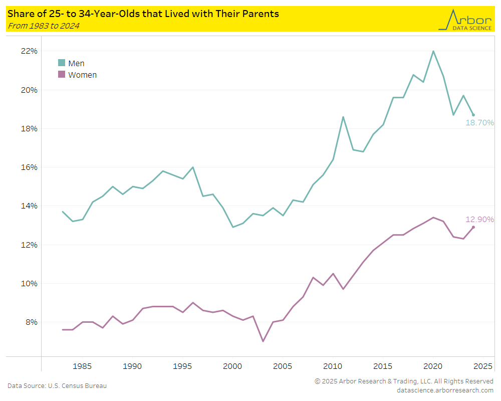 - According to data from the U.S. Census Bureau, 18.70% of young men and 12.90% of young women lived with their parents in 2024. While this was down slightly from the peak during the pandemic, it is still much higher compared to rates from 1983 to 2010.