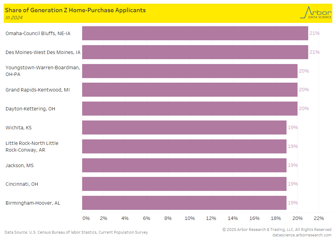 - The share of home-purchase applicants which are Gen Z was highest in Midwestern metro areas. In the Omaha-Council Bluffs and Des Moines-West Des Moines areas, 21% of applicants were Gen Z.