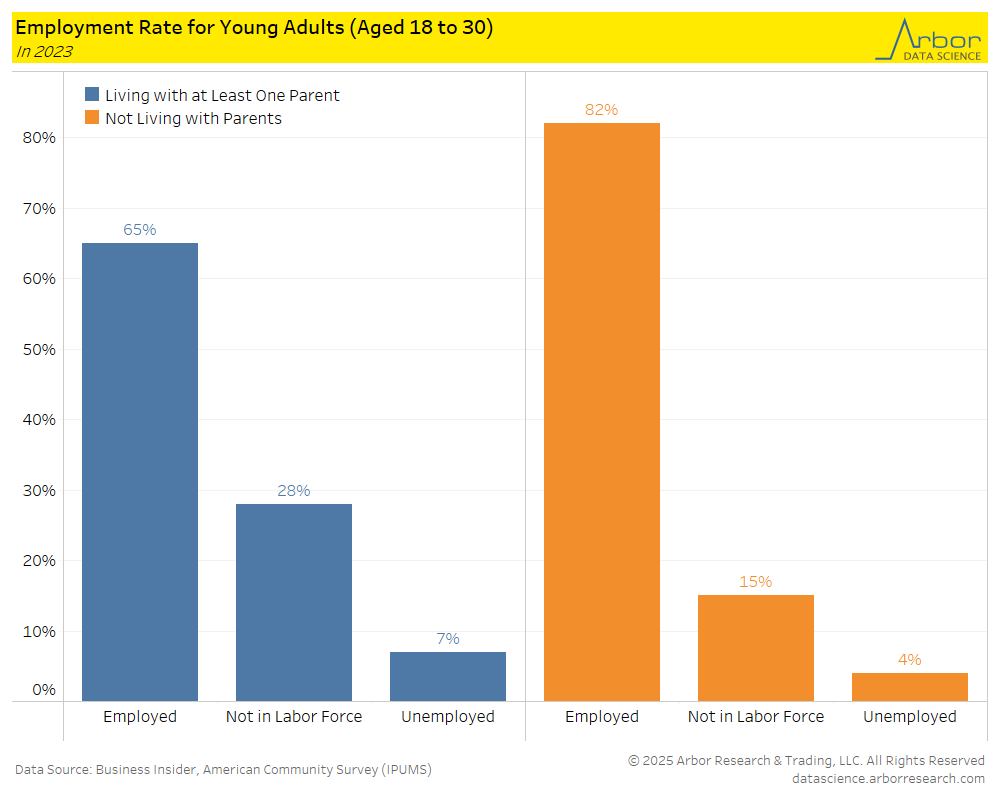 - For young adults, defined by Business Insider as those aged between 18 and 30, those not living with their parents had a higher employment rate (82%) compared to those living with at least one parent (65%) in 2023.