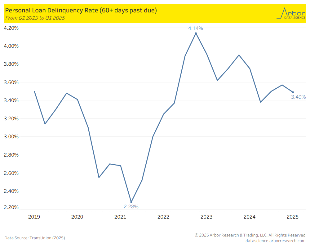 - According to LendingTree, in Q1 2025 3.49% of all personal loan accounts were 60 or more days past due.