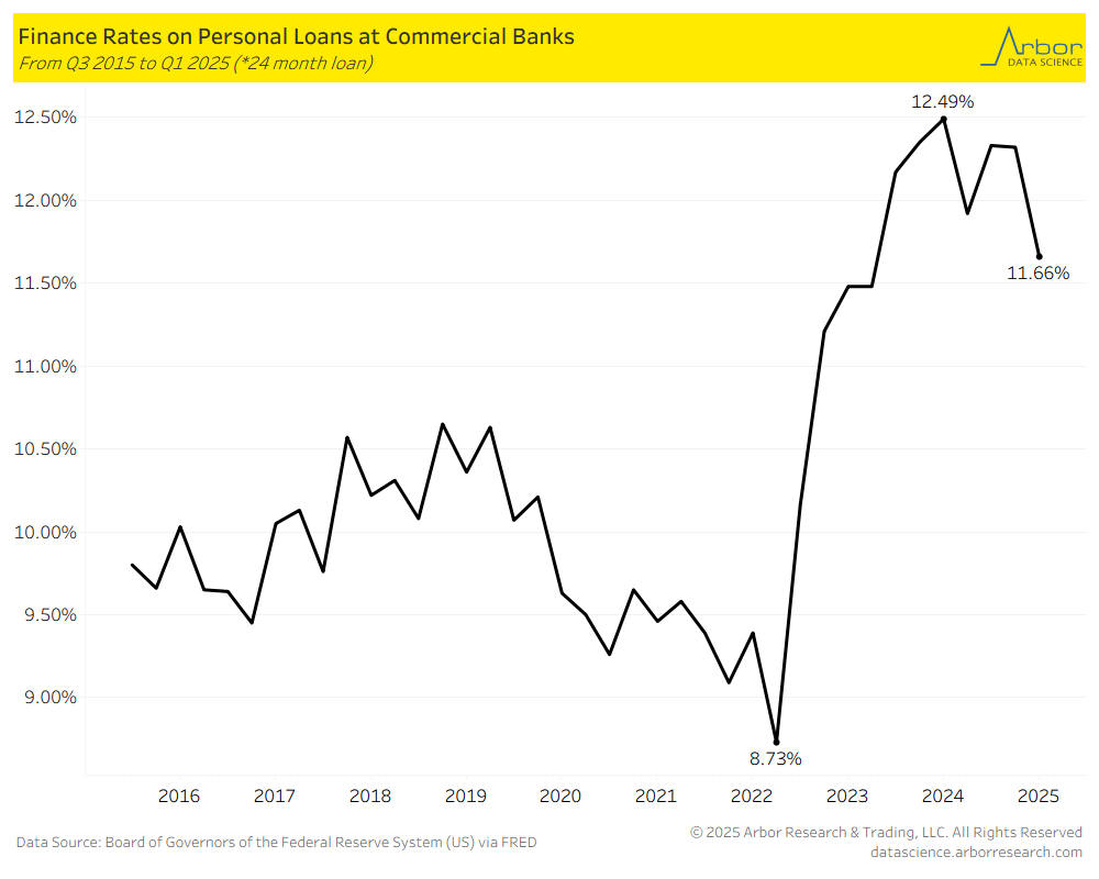 - The interest rates on 24 month personal loans were at 11.66% in Q1 2025, down from a year ago at 12.49% in Q1 2024.