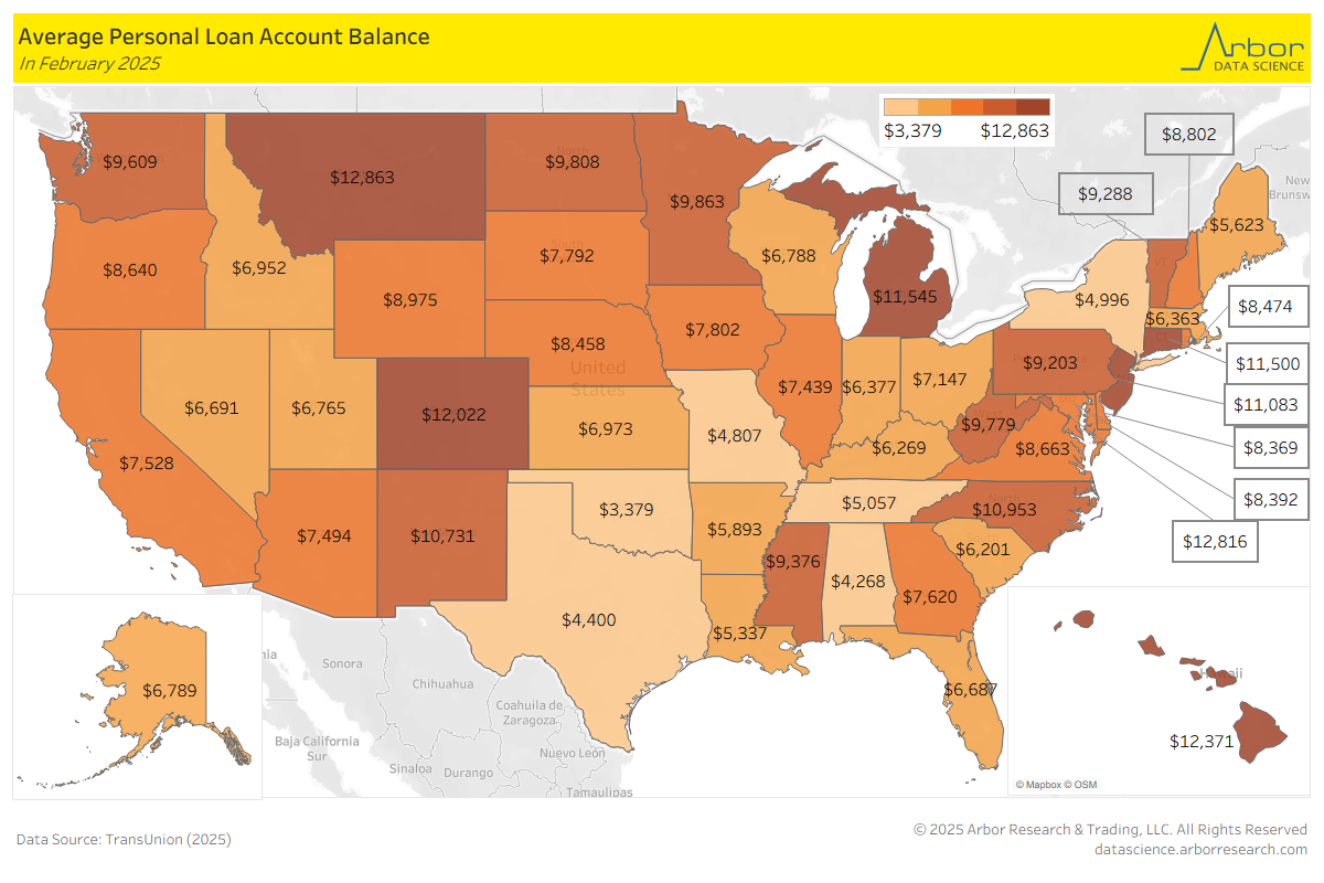 - The heatmap below outlines the average personal loan balances in February 2025.
