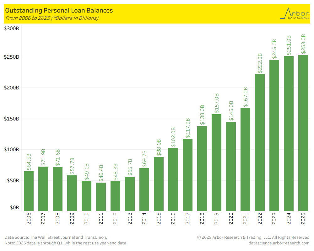 - The chart below outlines the outstanding personal loan balances from 2006 to 2025. In 2025, the balance was $253 billion, the highest amount of personal debt for the time period.