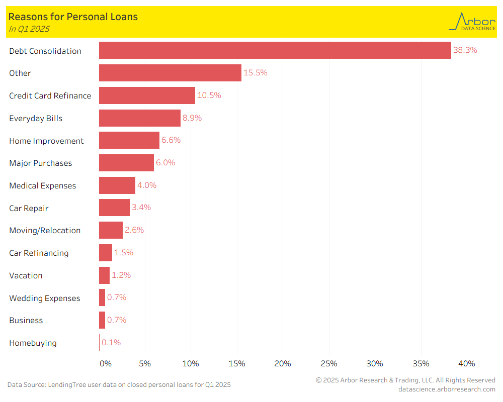 - The most popular reason that consumers borrow via personal loans was Debt Consolidation at 38.3%.