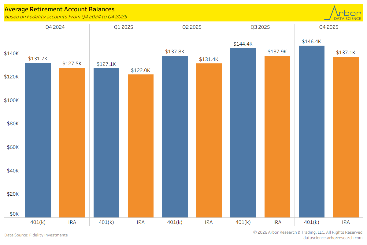 - The average IRA account balance at Fidelity increased from $127,500 in Q3 2025 to $137,100 in Q4 2025.