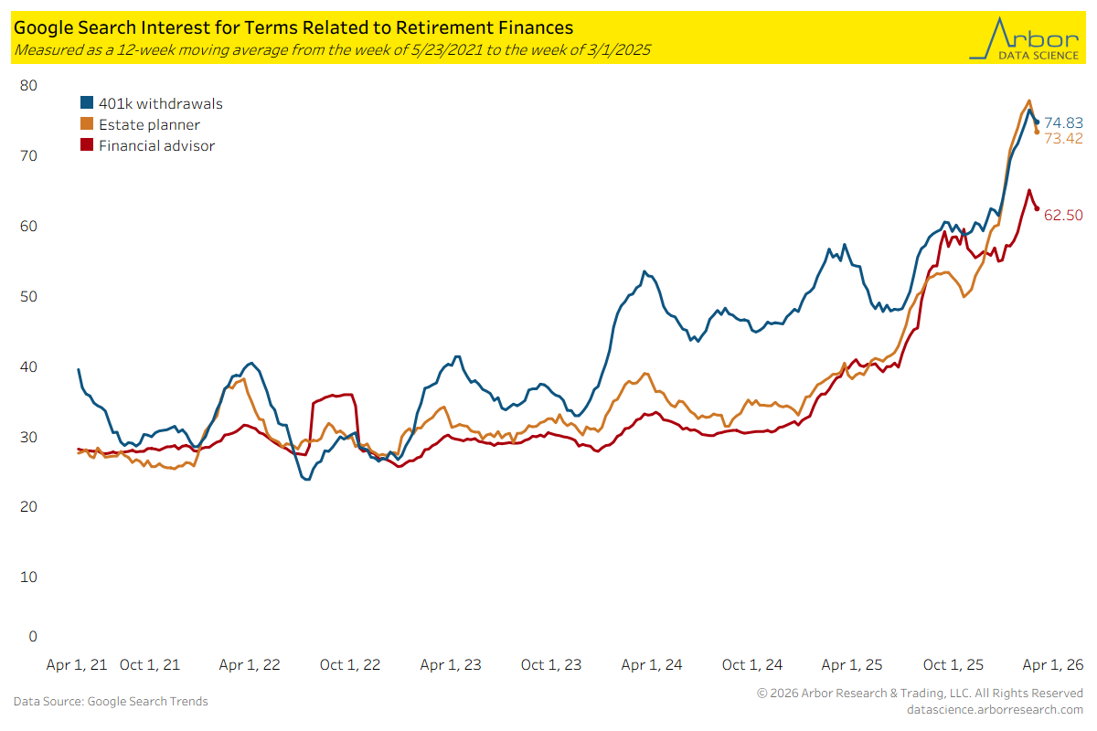 - Interest for the term 401k withdrawals was 74.83 for the week of 3/1/2026. Interest was 73.42 for an estate planner and 62.50 for a financial advisor.