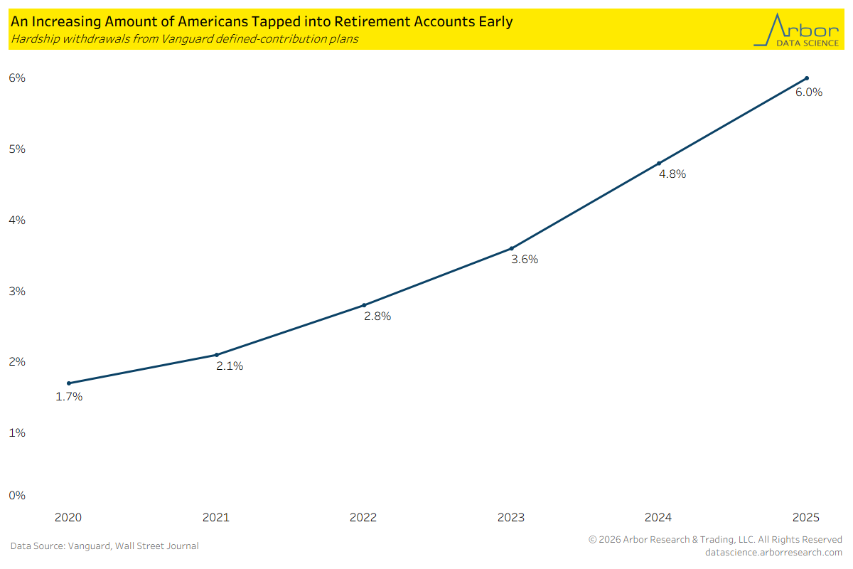 - According to Vanguard, 6% of individuals with a Vanguard-administered 401(k) account utilized a hardship withdrawal in 2025. This was the highest reading over the period from 2020 to 2025.