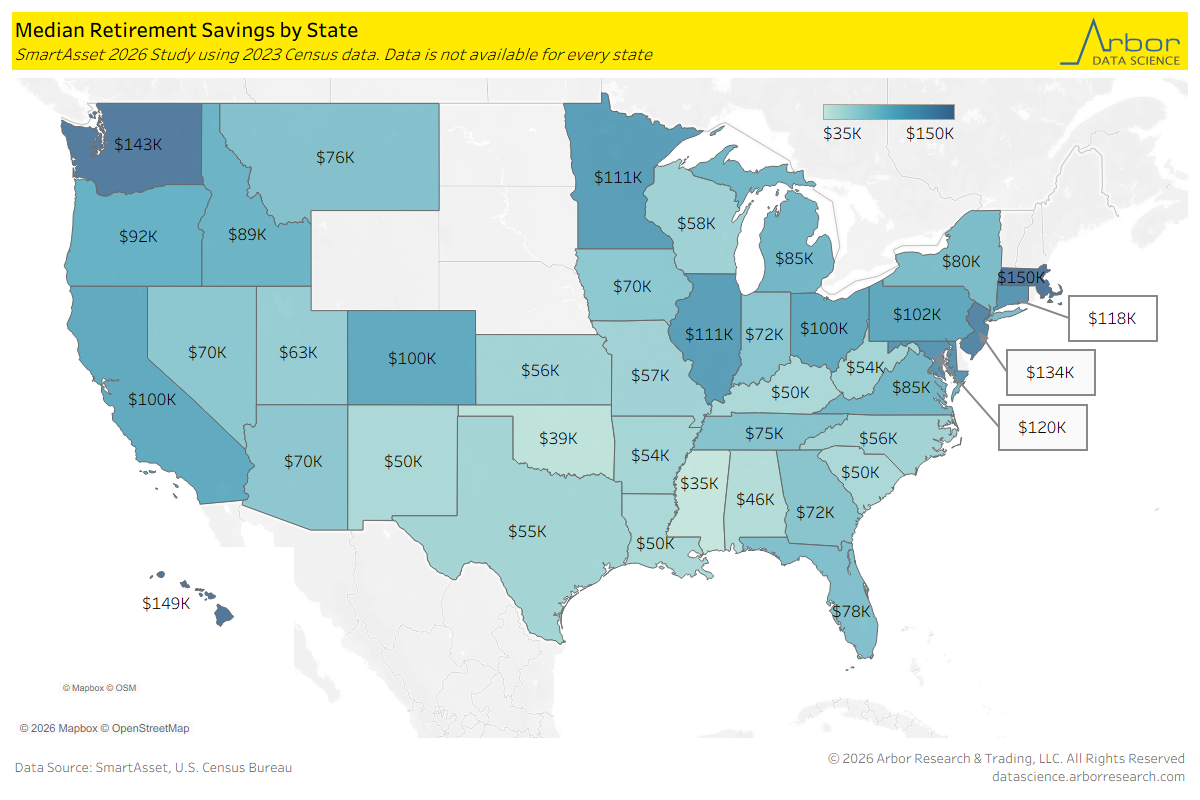 - SmartAsset analysis of the 2023 Census found the median retirement savings of individuals living in Massachussets was $150,000, which was the highest of any state. The two other states with median retirement savings above $140,000 was Hawaii, at $149,000, and Washington, at $143,000.