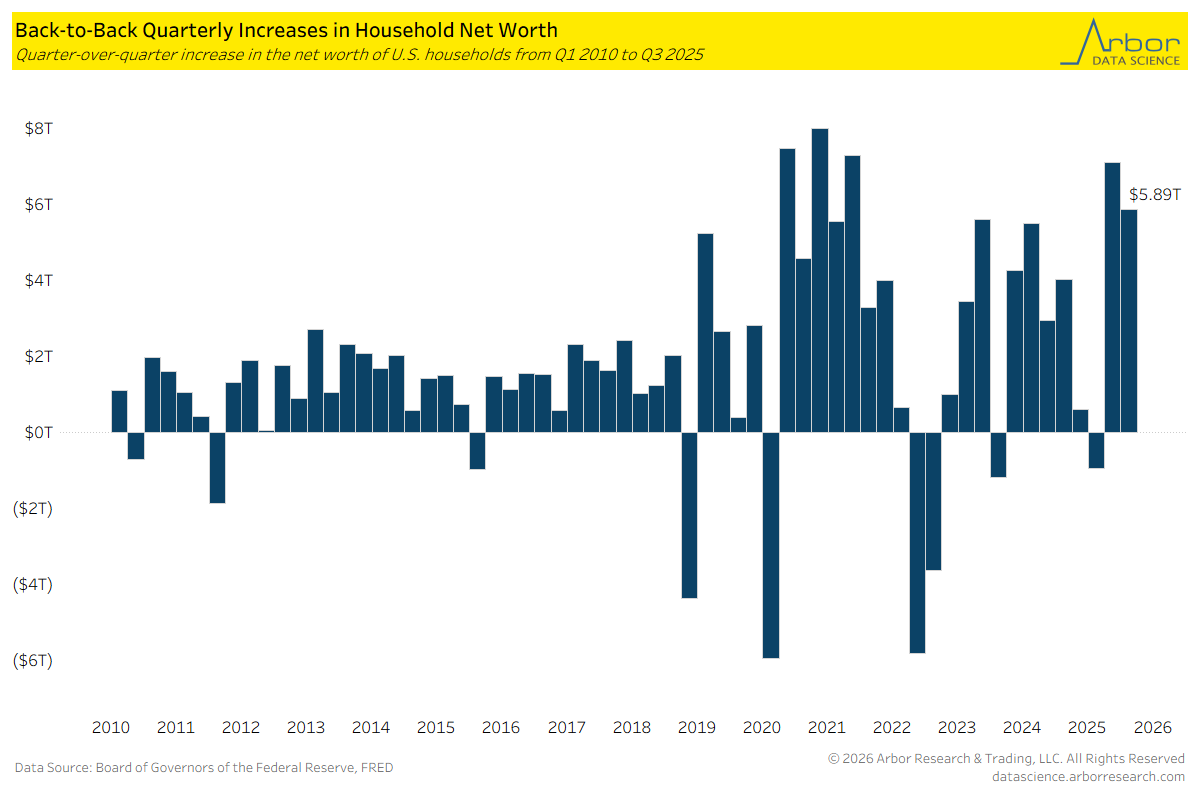 - The net worth of U.S. households increased by $5.89 trillion from Q2 2025 to Q3 2025. This was the second consecutive quarter with an increase.