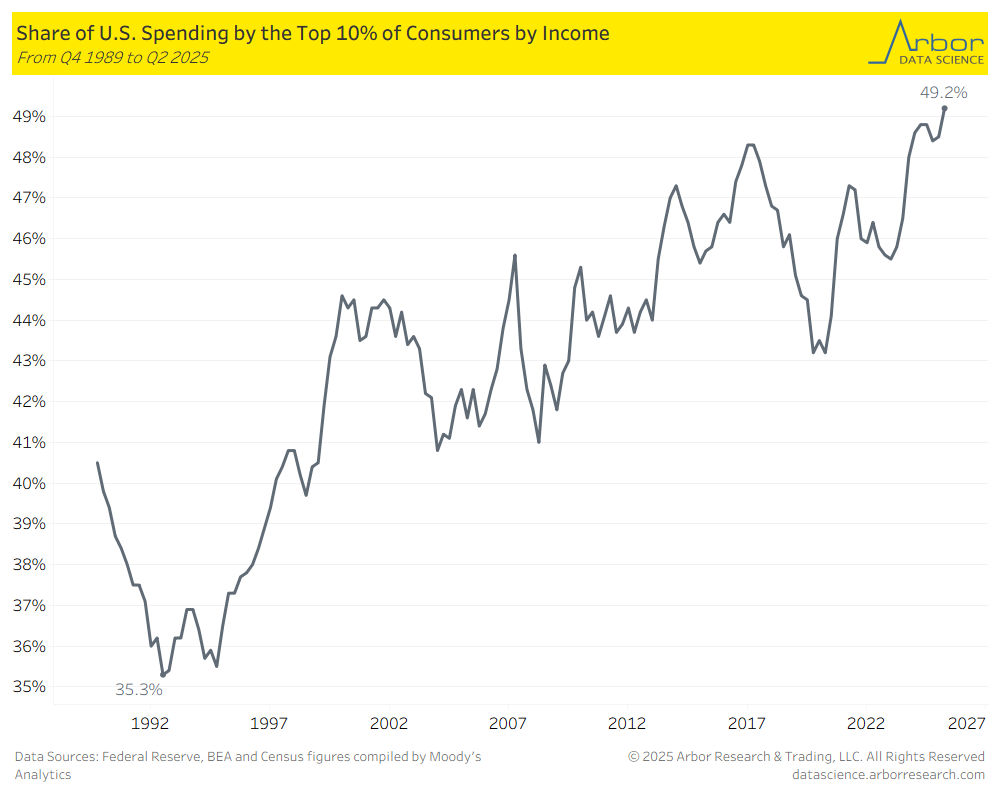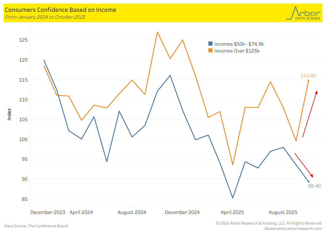 Currently, there is a radical bifurcation between those with elevated incomes and everyone else. Those with higher incomes view the current state of the economy as radically different from those with lower incomes. That should not be taken as a shock. The “One Big Beautiful Bill” had several things that would provide tailwinds to higher income earners going forward. Global equity markets are doing well, and the labor market has yet to crack in any meaningful way. For higher income earners, that is going to spur stronger confidence and keep consumption patterns intact.