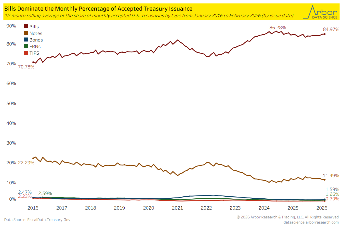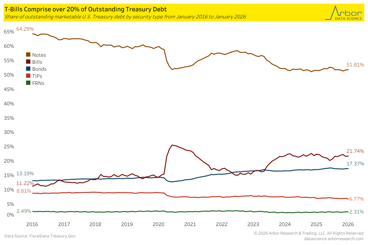 - T-Bills were 21.74% of outstanding debt in January 2026, almost double the level of 11.22% ten years prior.