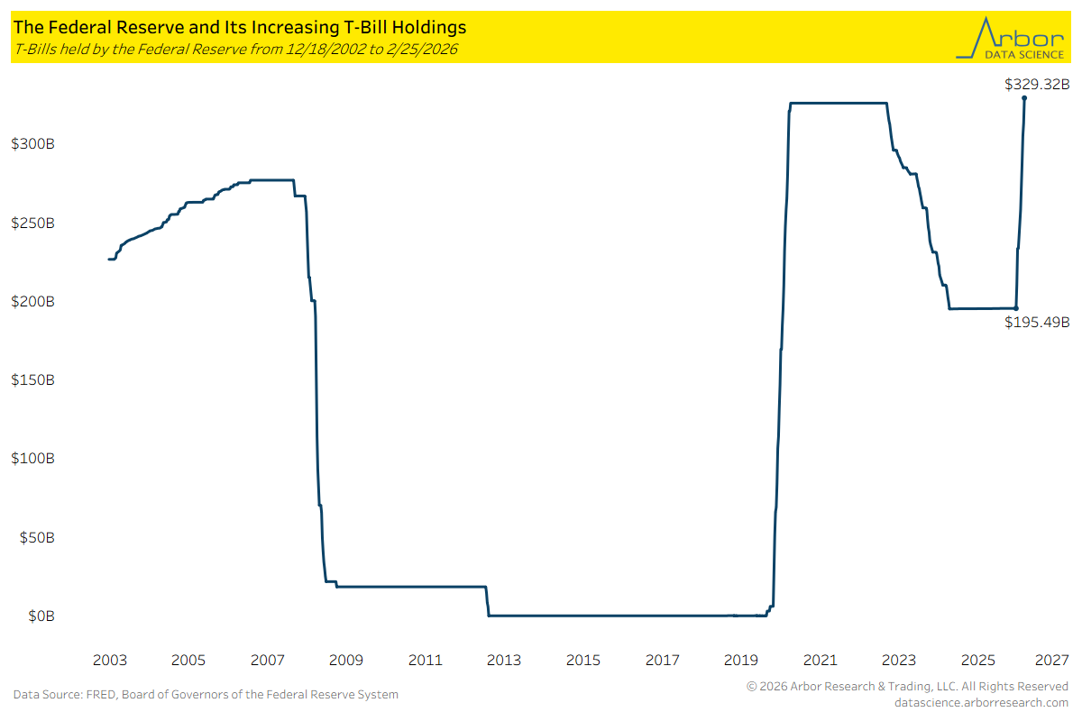 - The Federal Reserve’s Secured Open Market Account (SOMA) held $329.32 billion worth of T-Bills for the week ended 2/25/2026. This was the highest level of holdings over the period from 12/18/2002 to 2/25/2026.