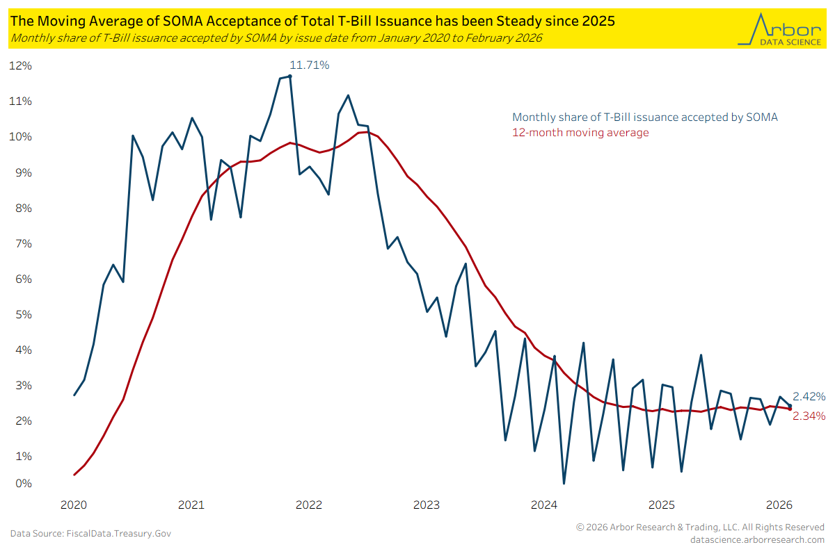 - The 12-month moving average of total T-Bill issuance accepted by SOMA was 2.34% in February 2026. This average was stable in the mid 2 percents over the past 18 months (September 2024 to February 2026). From May 2021 to October 2022, the average was above 9%.
