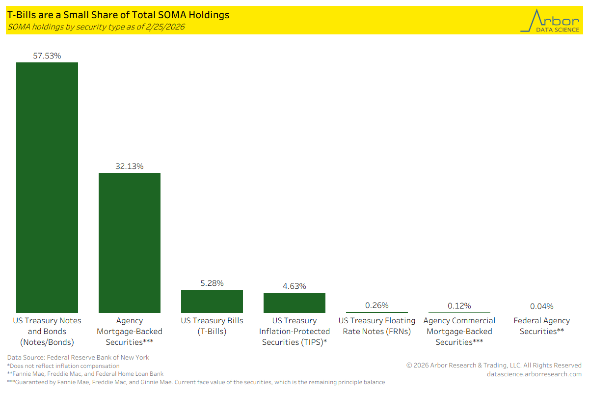 - U.S. Treasury Notes and Bonds comprised 57.53% of all SOMA holdings as of 2/25/2026. This was the largest share of any security type.