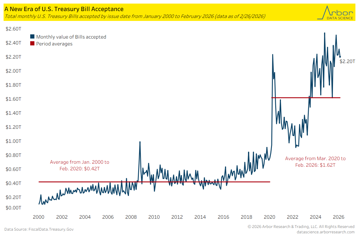 - The monthly average of T-Bills accepted at auction was $0.42 trillion from January 2000 to February 2020. From March 2020 to February 2026, the monthly average was $1.62 trillion, which was almost four times the average from the previous period.