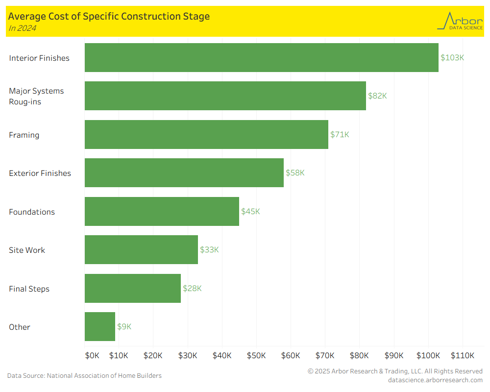 - The average cost of building a new home in 2024 was $428,000. The largest portion of cost comes from the Interior Finishes (Insulation, drywall, interior trims, doors, mirrors, etc.) at $103,000, followed by Major System Rough-Ins (plumbing and electrical, HVAC) at $82,000.