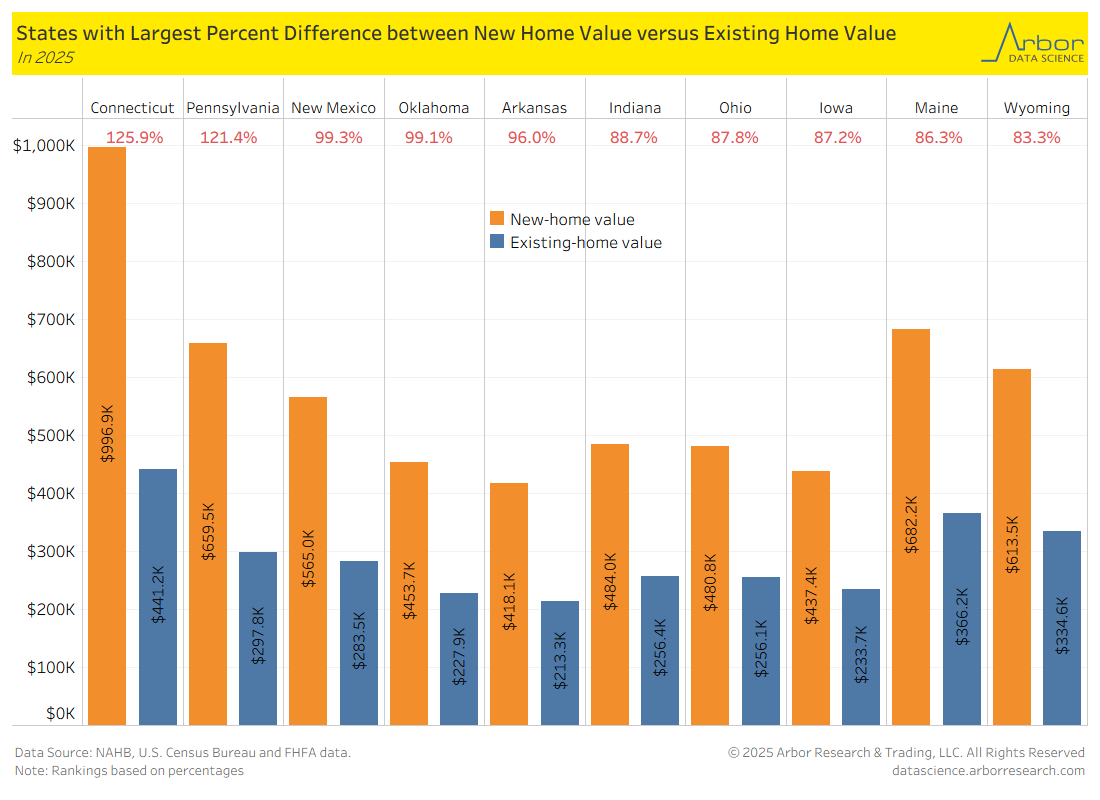 - The chart below outlines the difference, as a percentage, between a new home value and an existing home value for the top 10 states in 2025.