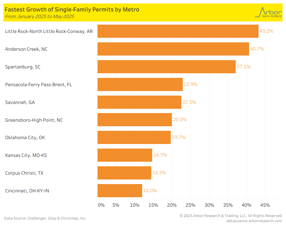 - The chart below highlights the metros with the fastest growth for building permits for single family homes from January 2025 to May 2025.