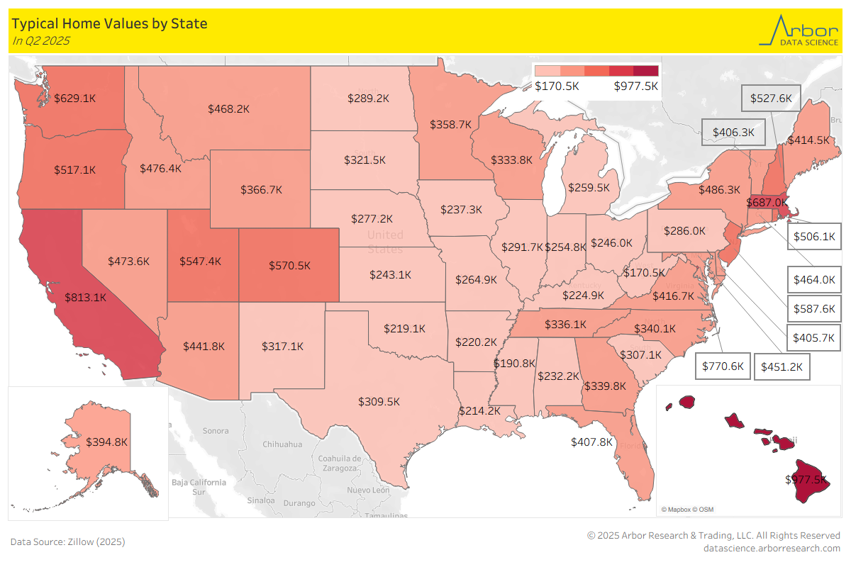 - The heatmap below outlines the average single-family home value by state in Q2 2025. For reference, the average single-family home value in the U.S. in Q2 2025 was $371,133.